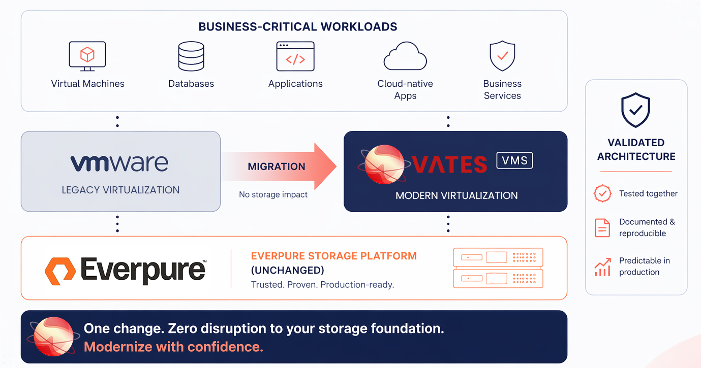 Everpure provides a proven storage foundation. Vates VMS enables organizations to evolve their virtualization layer without impacting that existing infrastructure.